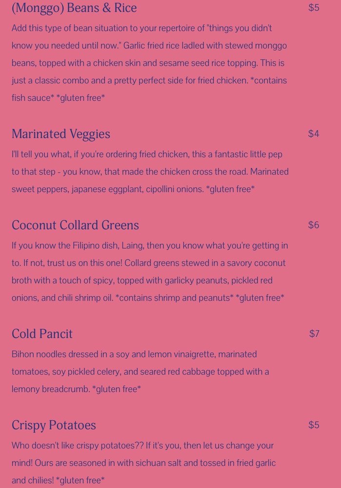 If you know the Filipino dish, Laing, then you know what you're getting in to. If not, trust us on this one! Collard greens stewed in a savory coconut broth with a touch of spicy, topped with garlicky peanuts, pickled red onions, and chili shrimp oil.*contains shrimp, peanuts**gluten and dairy free*